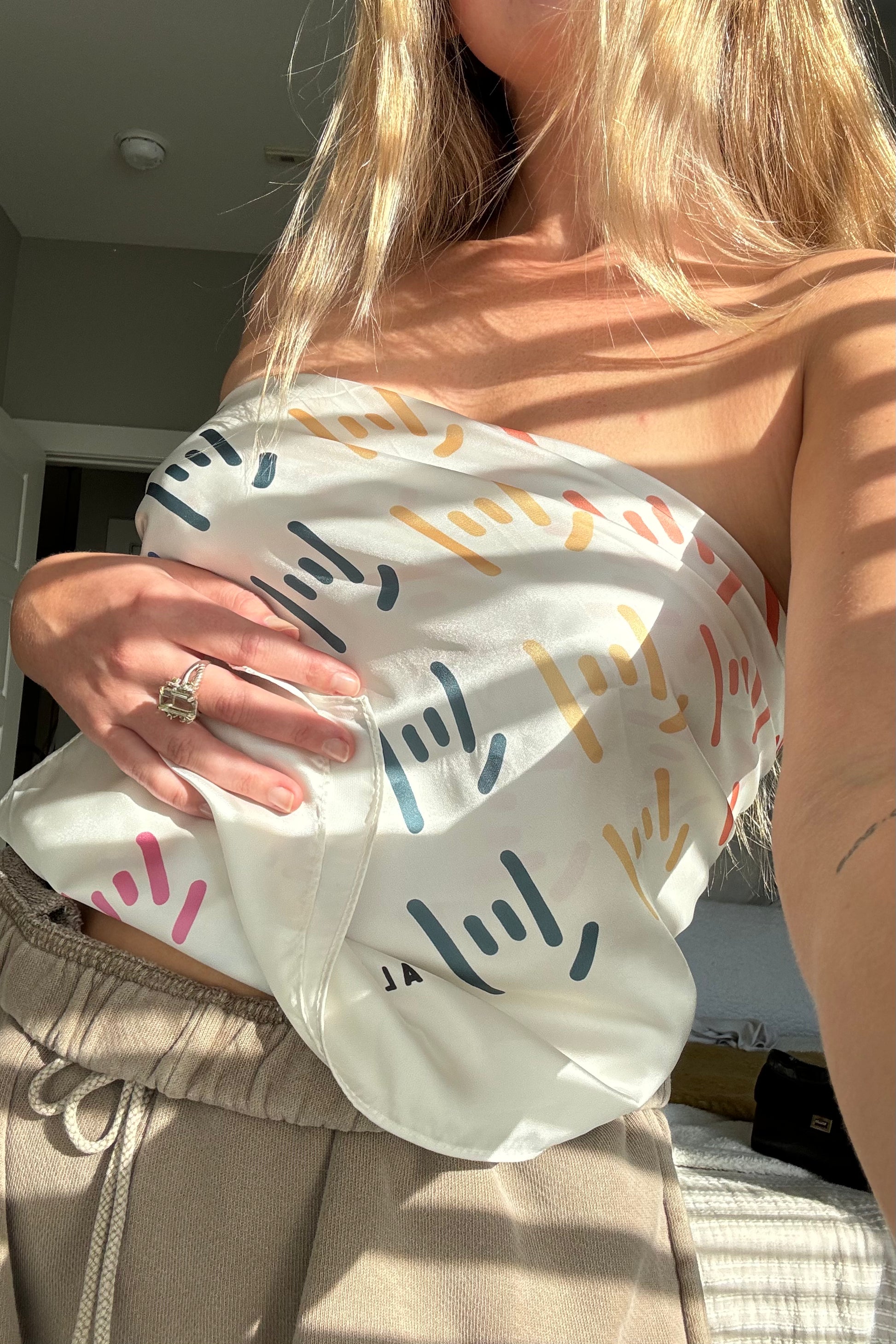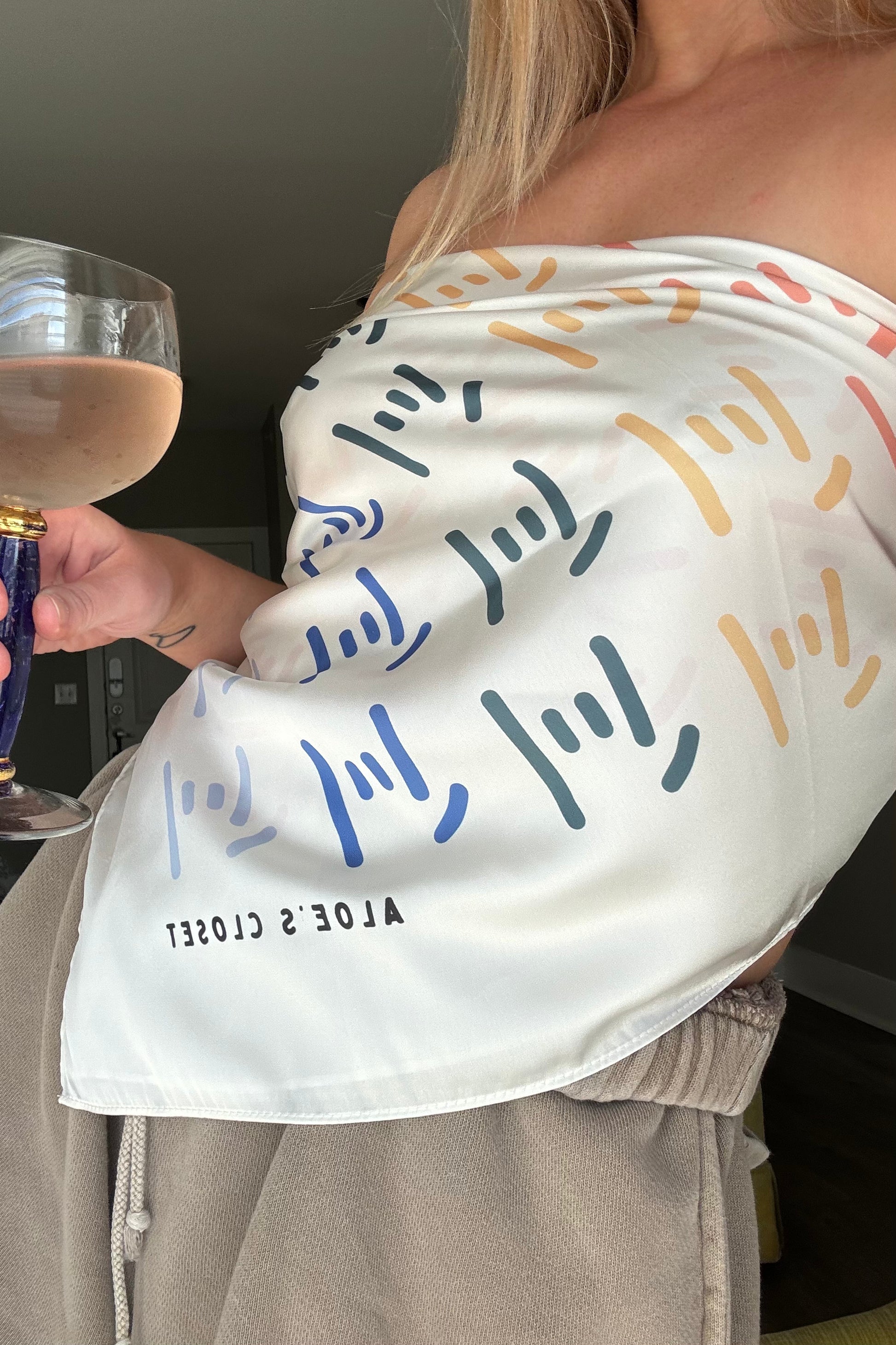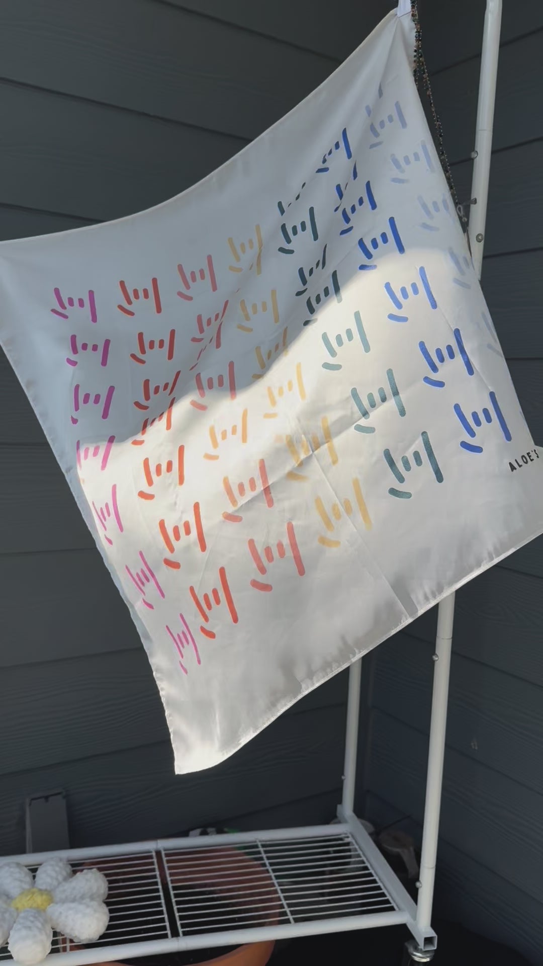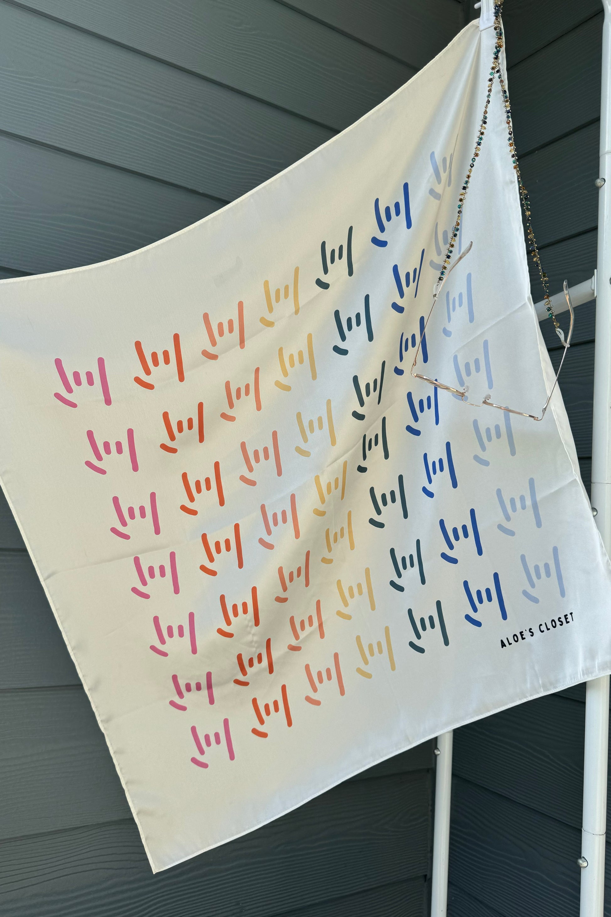 Our Aloe's Closet twist on the bandana! Made from silky fabric with a lovely twist ;) Pattern is our signature ILY hand in our own version of rainbow. Wear it as your heart desires- headband, scarf, t-shirt, wrap it around your purse, belt loop or your furry friend. Size: 28" x 28"